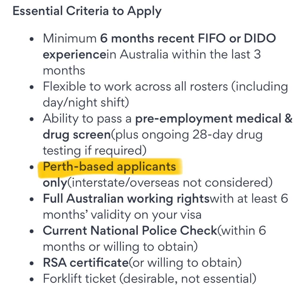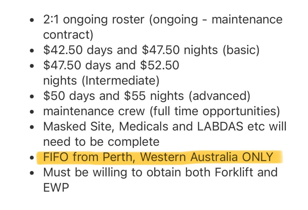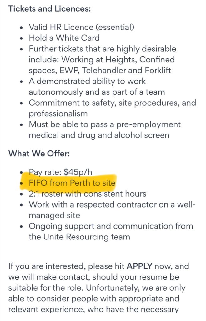 エージェント・会社から送られてくるメールや、Seekの掲載でも、”FIFO from Perth, only”、”FIFO ex WA”のようなコメントが付いていることが、ここ最近増えた気がします。