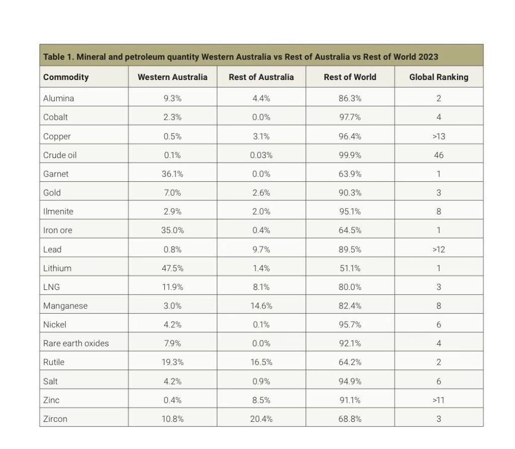 そして、以下の表からも、オーストラリアが世界ランキングでもトップクラスで、鉄鉱石やリチウム、ガーネットなどが特にWAが多くを占めているのがわかります。先ほどの分布地図でも、鉄鉱石(Iron ore)の赤い丸がWAに多く分布していましたね!