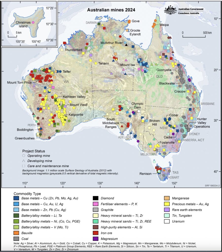 Australian Government Geoscience Australia(オーストラリア政府の地球科学機関)のホームページにて公開されている以下の地図は、2024年12月時点のオーストラリアの操業中鉱山、開発中鉱山、および管理・保守中の鉱山の位置と状況を示しています。