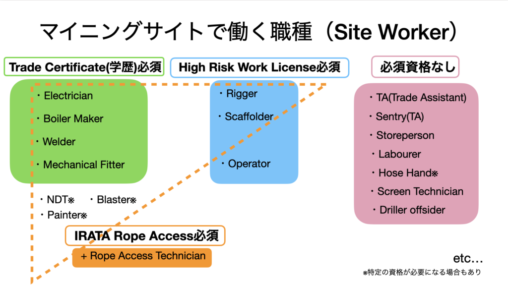 - 水色:オーストラリアでHigh Risk Work Licenseの取得が必要だが、学歴は不要。