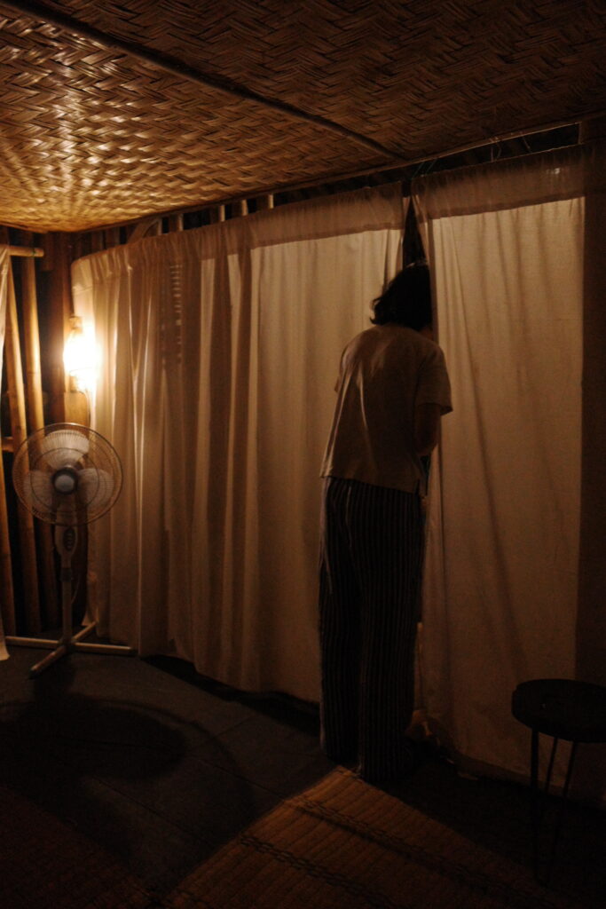 寝る時は、蚊帳を使います。壁という壁がほぼないので、彼はアイマスクをして二度寝をしていました。