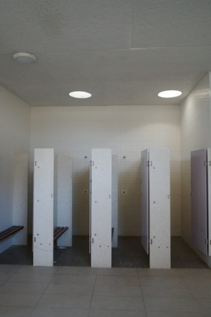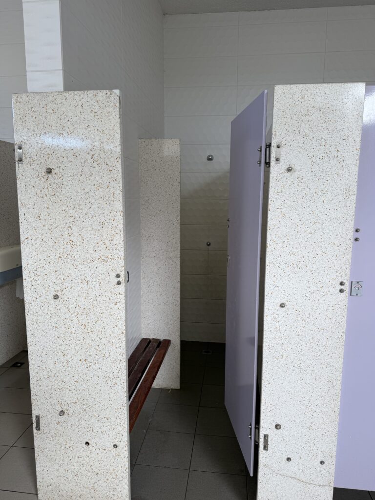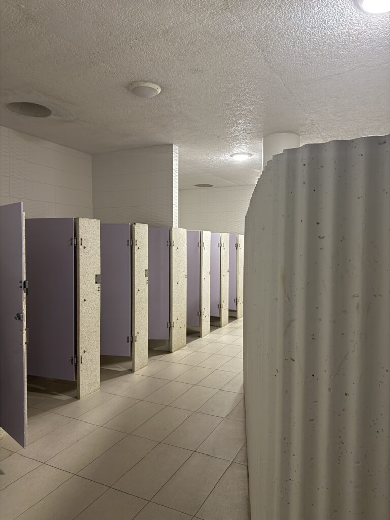 これは女子トイレの様子。写真手前がトイレ、奥がシャワーになります。シャワーは男女ともに4部屋ずつあります。
