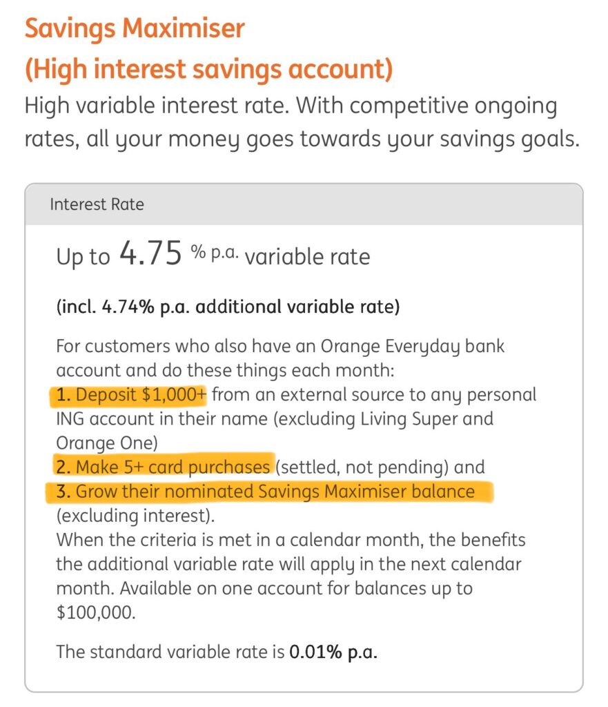 ING銀行のSaving Maximiser(預金口座)の高金利を満たすために、ING銀行とは別に銀行が必要というわけで、すでに他の銀行を利用している方は、コモンウェルスでなくても、そのままその銀行を利用したらいいと思います。(コモンウェルスとINGの併用は、個人的にシンプルで気に入っています。)