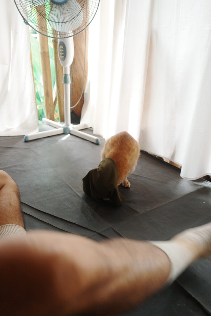 わたしの足の間から顔を覗かせたChocoもバイバイ!