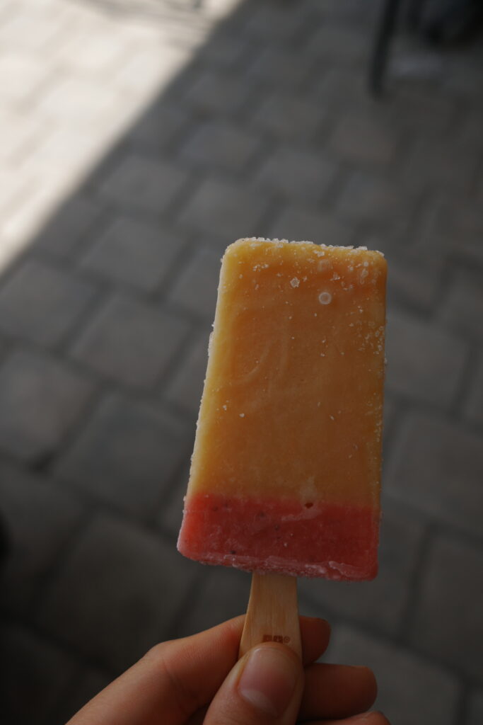 外で小さな子がカラフルなアイスを食べていて、美味しそうだったのでこちらのアイスに。マンゴー&ストロベリーの果汁100%ということでとても濃厚でした。