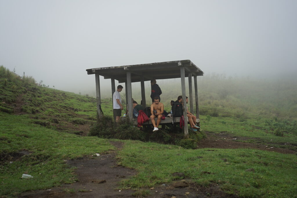 周りはガスガス。先に到着して休憩している他のツアー会社の人たち。