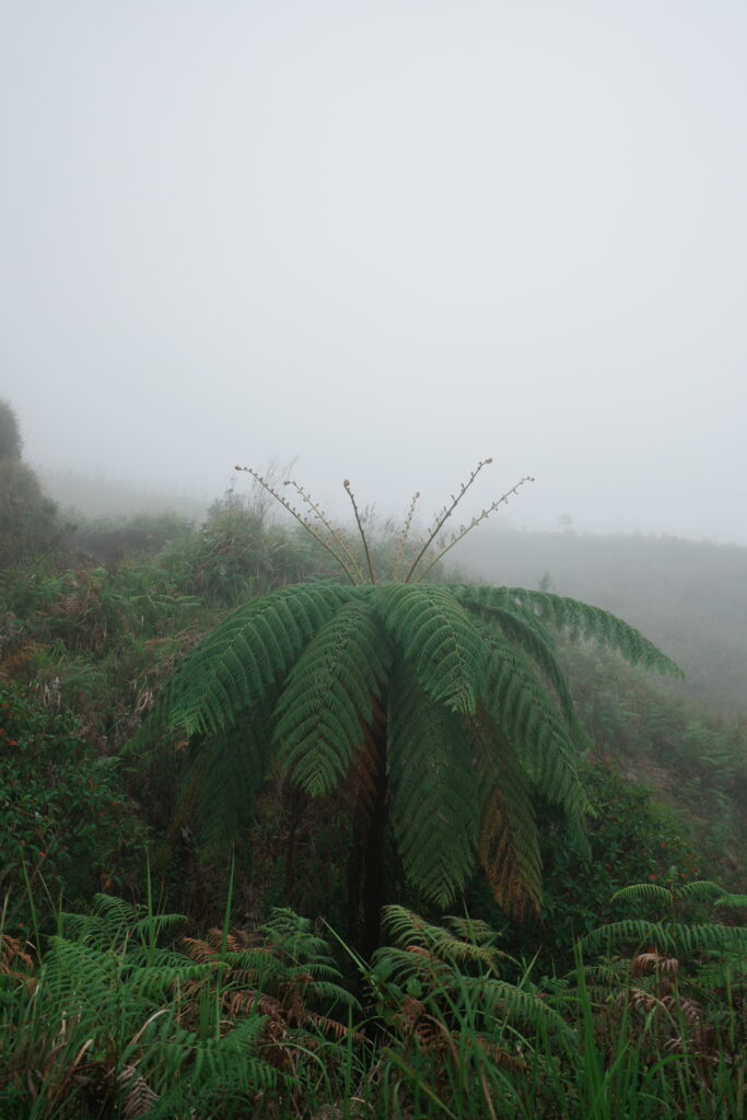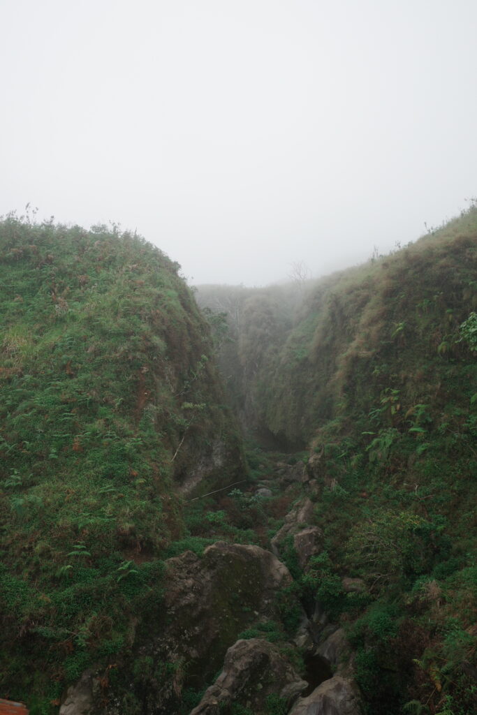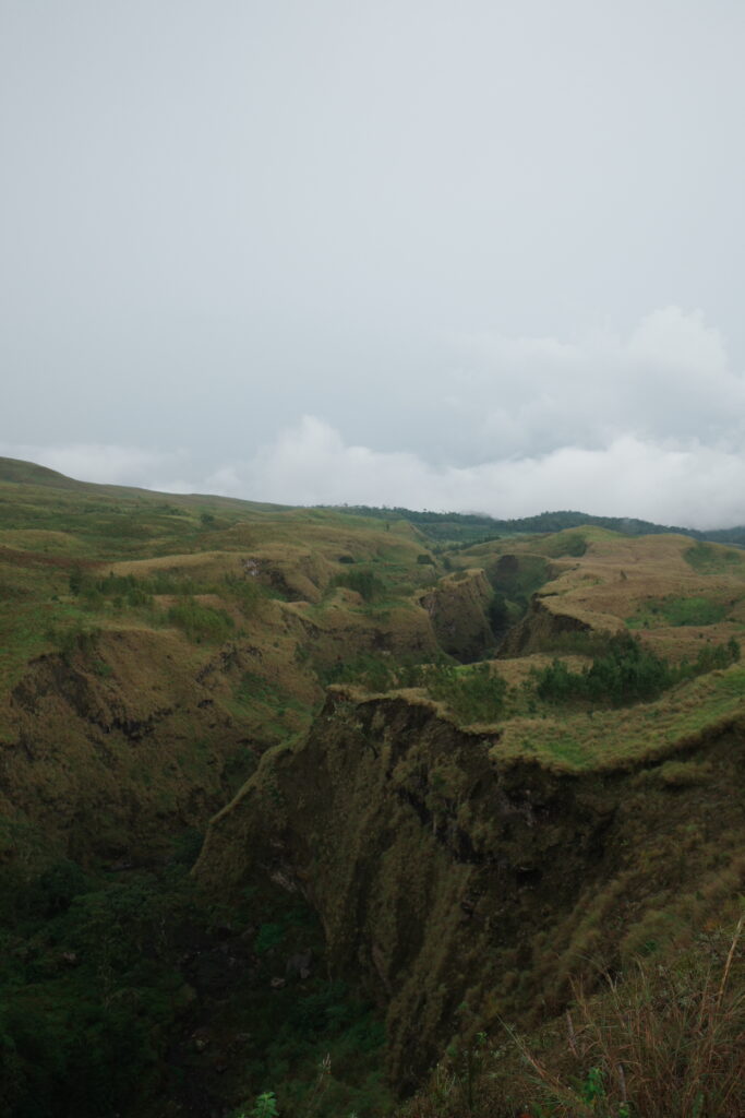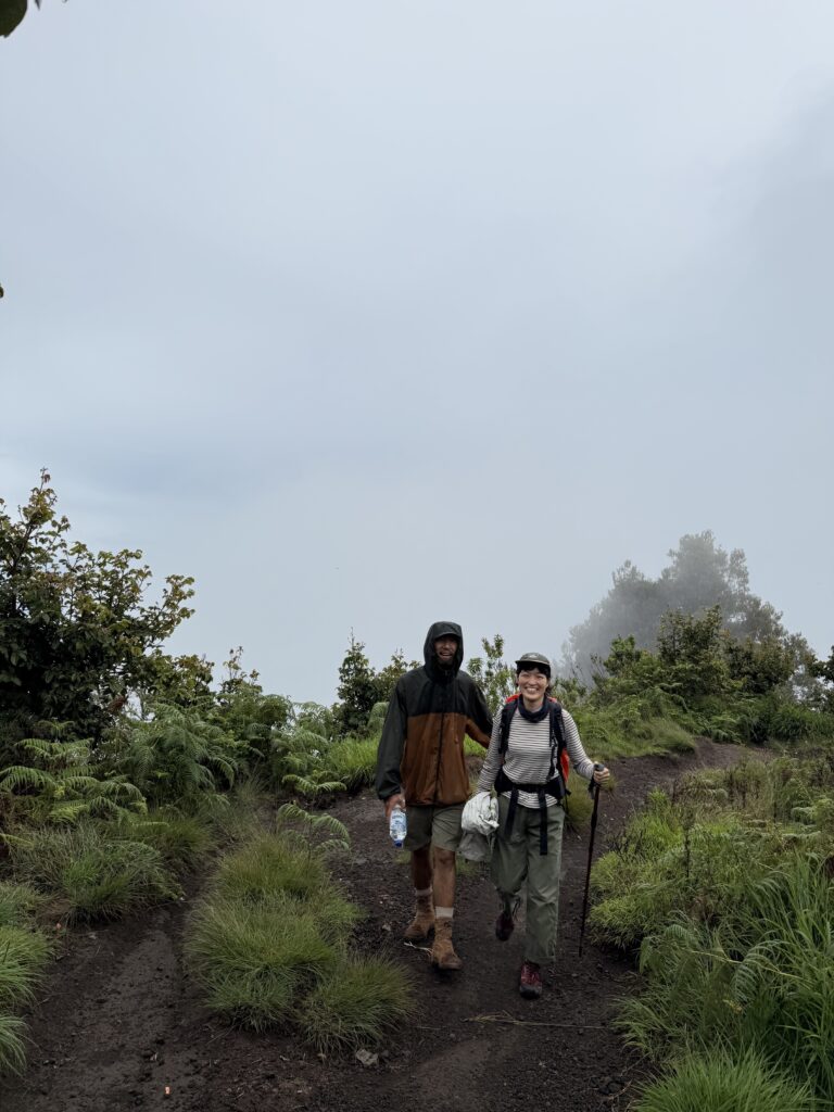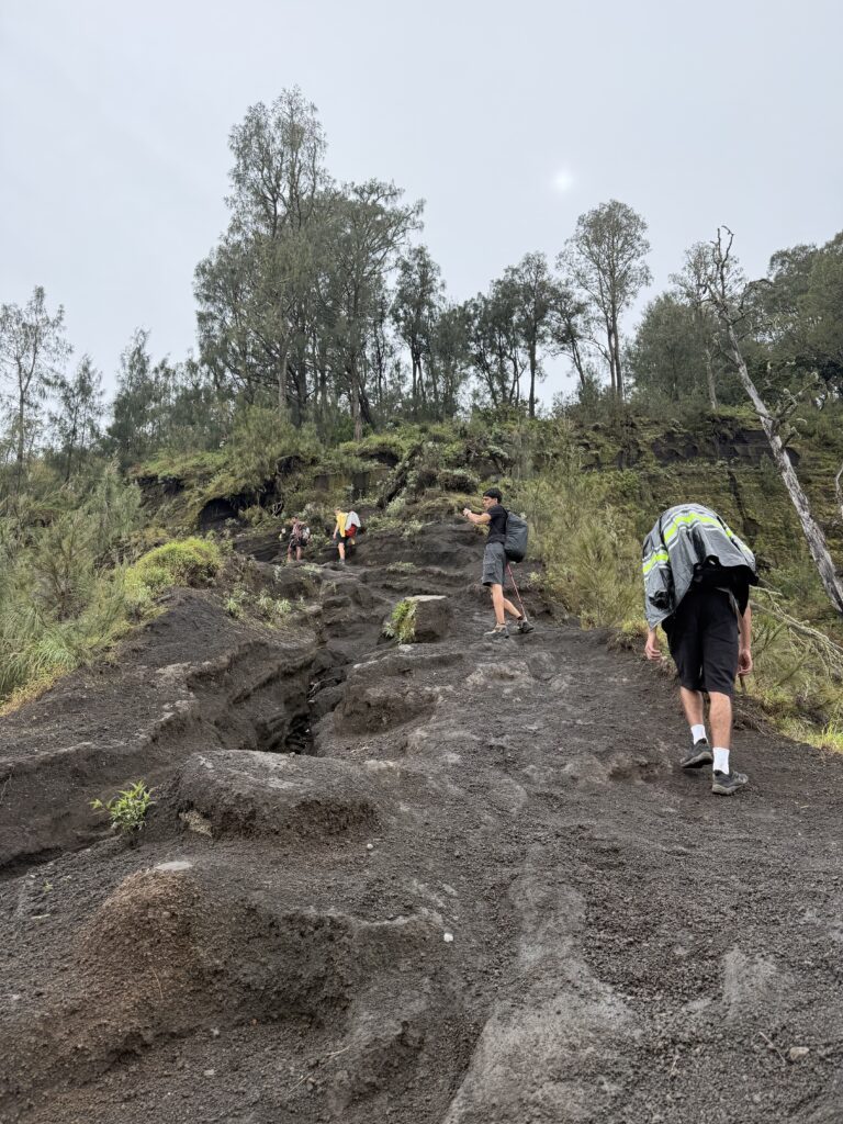 稜線に近づくと、こんな感じのかなり急な斜面で、かつ火山灰でできた道のため、ずるずる滑って登るのも大変でした!雨が降ったので地面が濡れていたので、まだマシだったかもしれないですが、それでもずるずる滑りました。