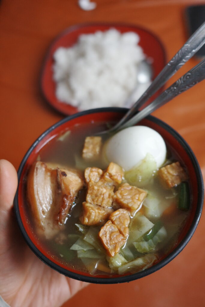 そのまましばらく休んでいると、本日の夕食、カレー味の野菜スープとご飯を持ってきてくれました!野菜がたっぷりで、体も温まっておいしかったです。