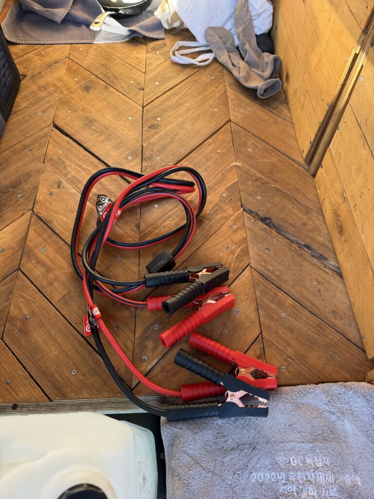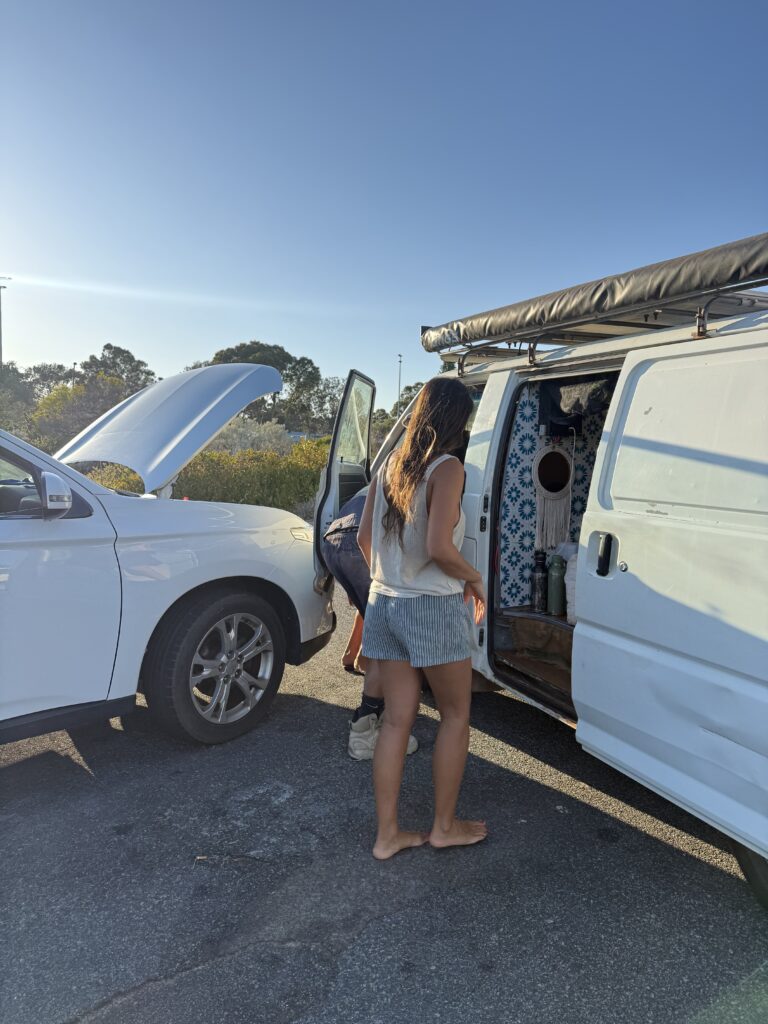 隣のバンも協力して、線を繋いですぐに復活。バッテリーが落ちた時ってこんなにあっけなく直るんですね。知らなかったです。無事に車は動き、彼は仕事へ向かいました。朝の6:30のこと。「めっちゃいい朝ねー」と笑う隣のバンの彼女。