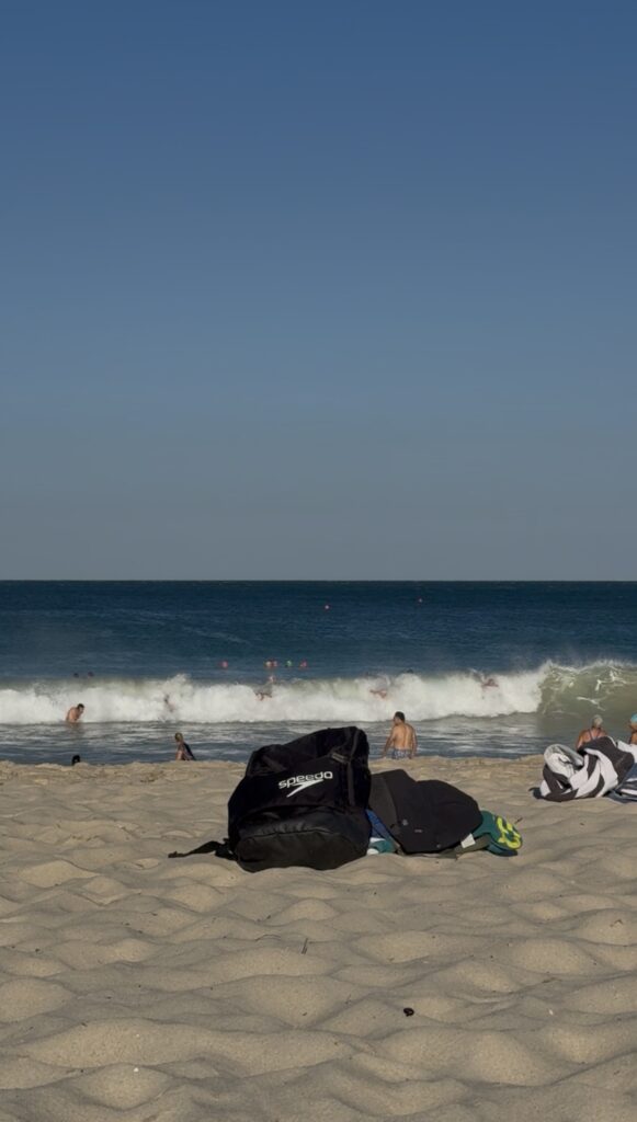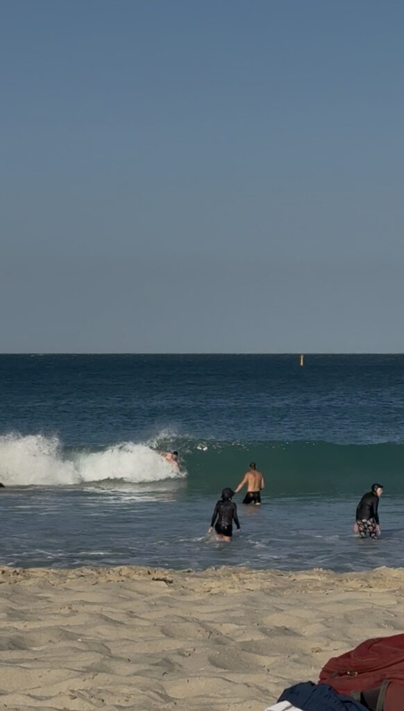 でかい波に乗って楽しむ人たち。残念なことに、わたしにはこの波は強すぎました泣。怖かったので浅瀬でパシャパシャして今日はおしまい。